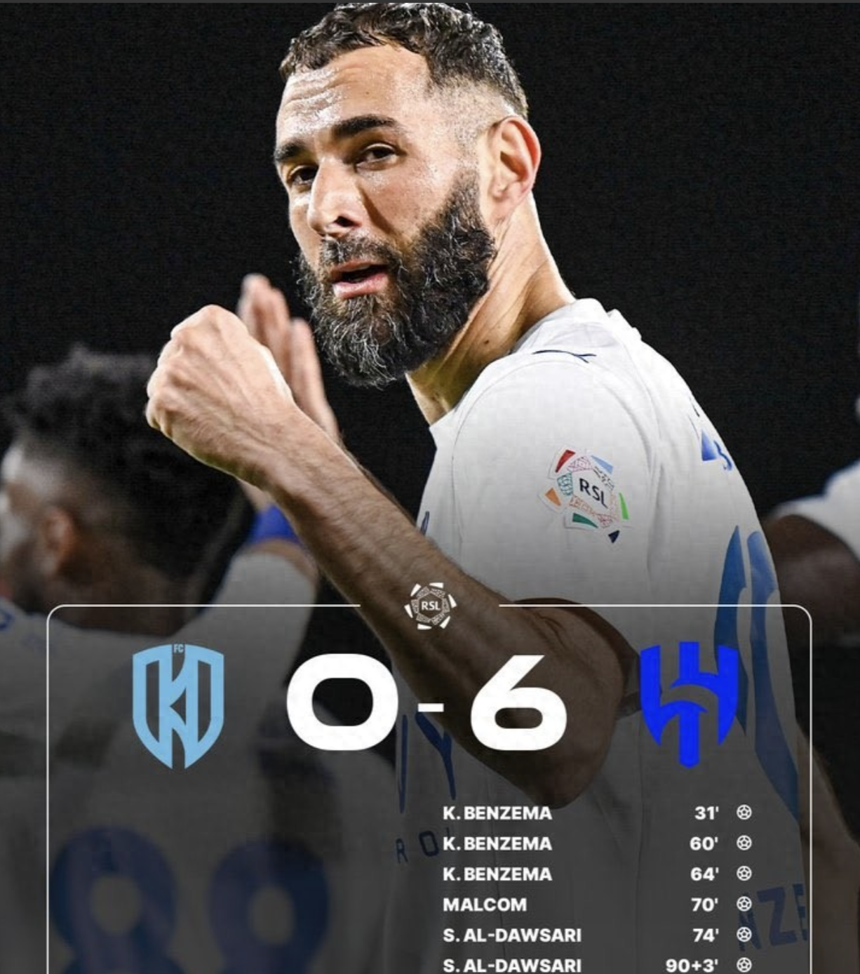 上半场第31分钟,利雅得新月打破僵局,本泽马在门前脚后跟破门,取得新月生涯首球,帮助新月1-0领先。易边再战,第60分钟,本泽马为新月再入一球。4分钟后,本泽马实现帽子戏法,3-0!第70分钟,又是本泽马立功,他助攻马尔科姆破门,比分来到4-0。之后本泽马在第72分钟被换下场休息,打卡下班。新月队长达瓦萨里梅开二度,新月6-0横扫阿科多。